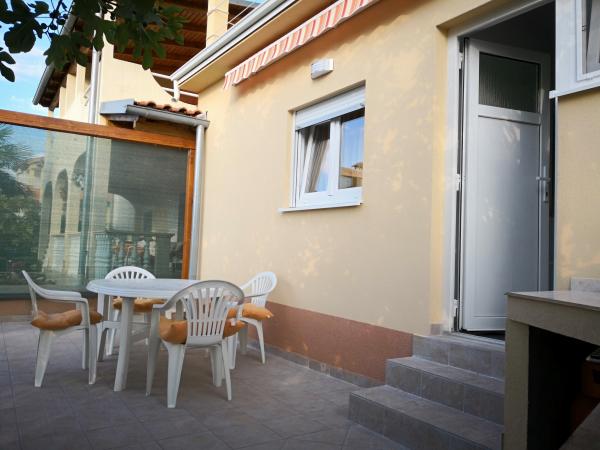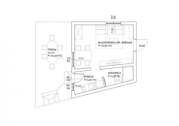 hladnjak sa ledenicom, ploča i pećnica za kuhanje, suđerica, mikrovalna, espresso caffe aparat, kuhalo vode, toster,… stol i stolice za blagovanje unutra i vani